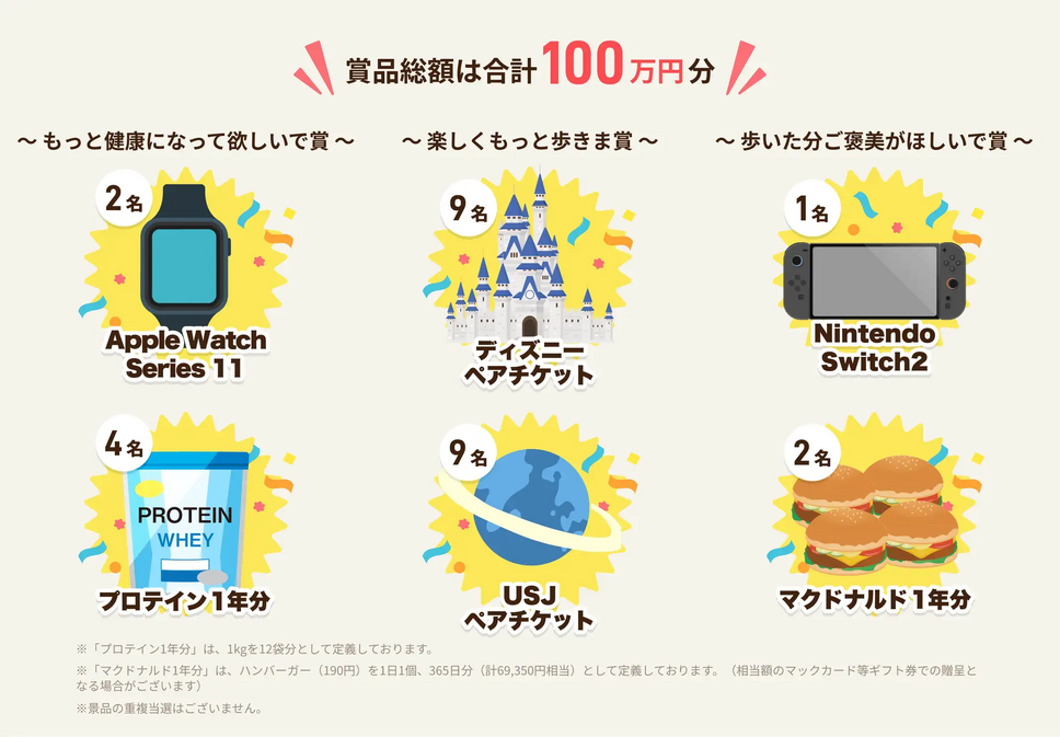 賞品には、Apple Watchやテーマパークのペアチケット、ゲーム機などが用意されています。