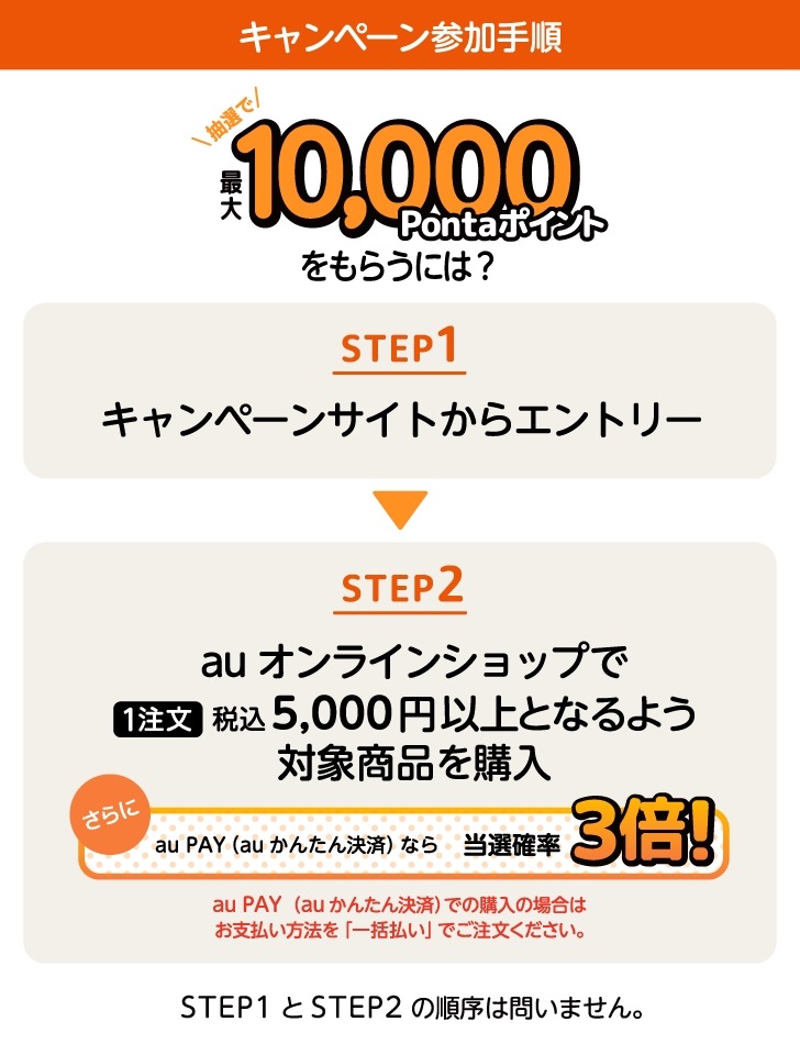 参加するには、キャンペーンサイトからau IDでエントリーを行い、au Online Shopに同じau IDでログインしたうえで、対象商品を1注文あたり税込5,000円以上購入する必要があります。