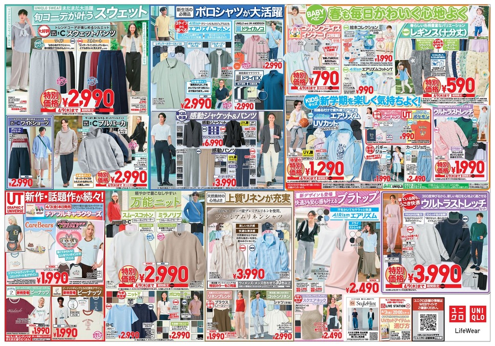 今週のユニクロチラシは、表面ではUVカットパーカやバギージーンズ、裏面ではスウェットやKIDS・BABYアイテムが目立つ内容でした。