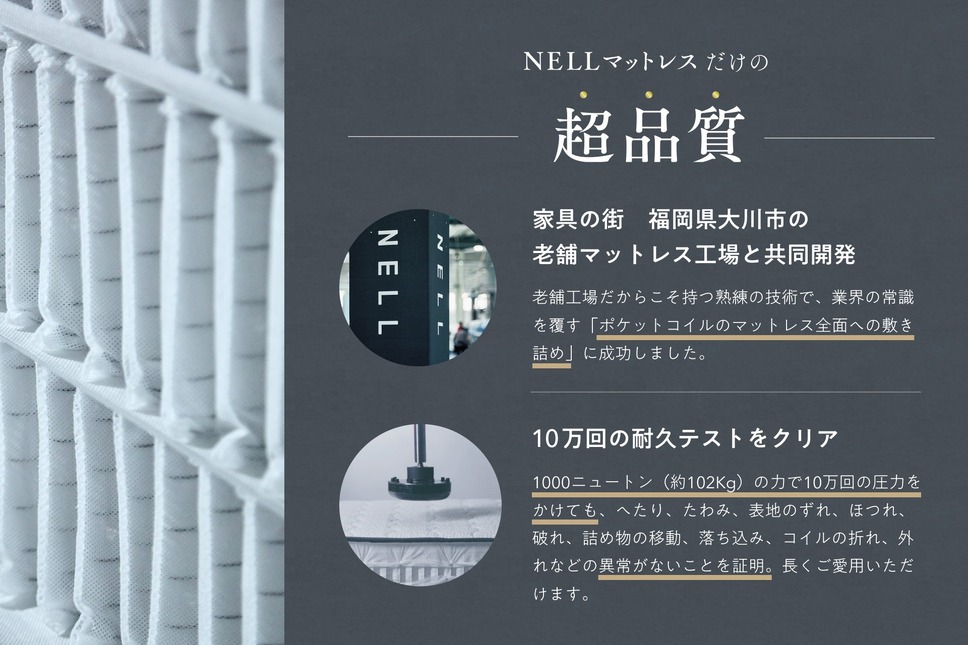 同製品は、家具の街として知られる福岡県大川市の老舗マットレス工場との共同開発によって誕生しました。多数のポケットコイルをマットレス全体に敷き詰めながら、10万回の耐久テストにも耐えうる「超品質」を実現しています。