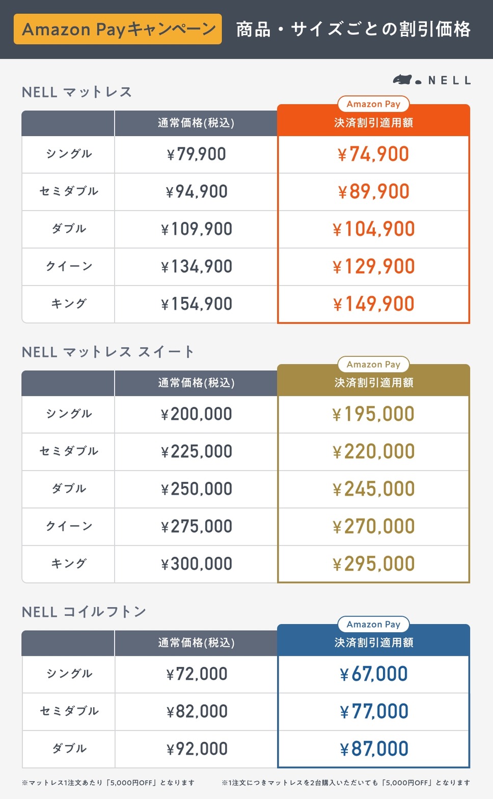 対象となるのは「NELL マットレス」「NELL マットレス スイート」「NELL コイルフトン」のいずれかを1台以上含む注文で、支払い方法をAmazon Payに設定した場合です。特典は1回の注文につき合計金額から5,000円オフとなり、他クーポンとの併用も可能です。