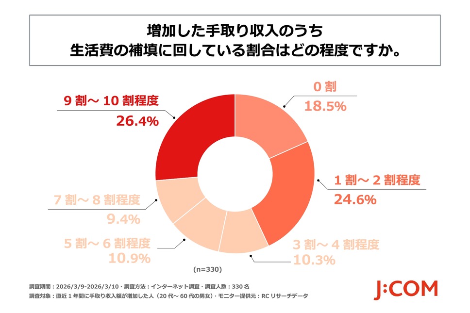 さらに、「増加した手取り収入のうち生活費の補填に回している割合」を尋ねると、「9割~10割程度」が26.4%で最多となり、4人に1人以上が増加分のほぼ全額を生活費に充てていることが明らかになりました。