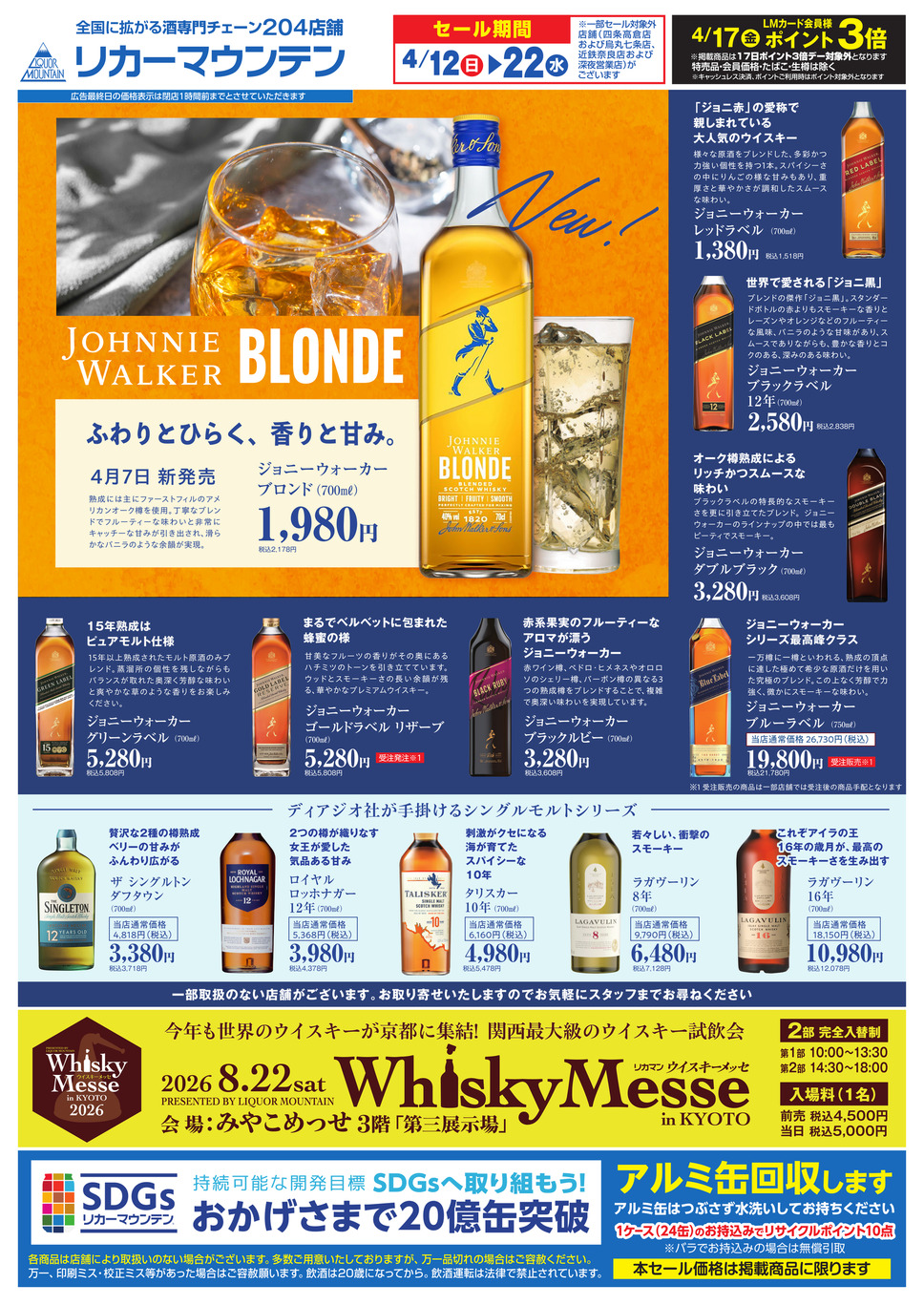 酒の専門店を全国に204店舗展開する株式会社リカーマウンテンは、2025年4月12日(日)から4月22日(水)までの11日間、「ジョニーウォーカーセール」を開催中です。