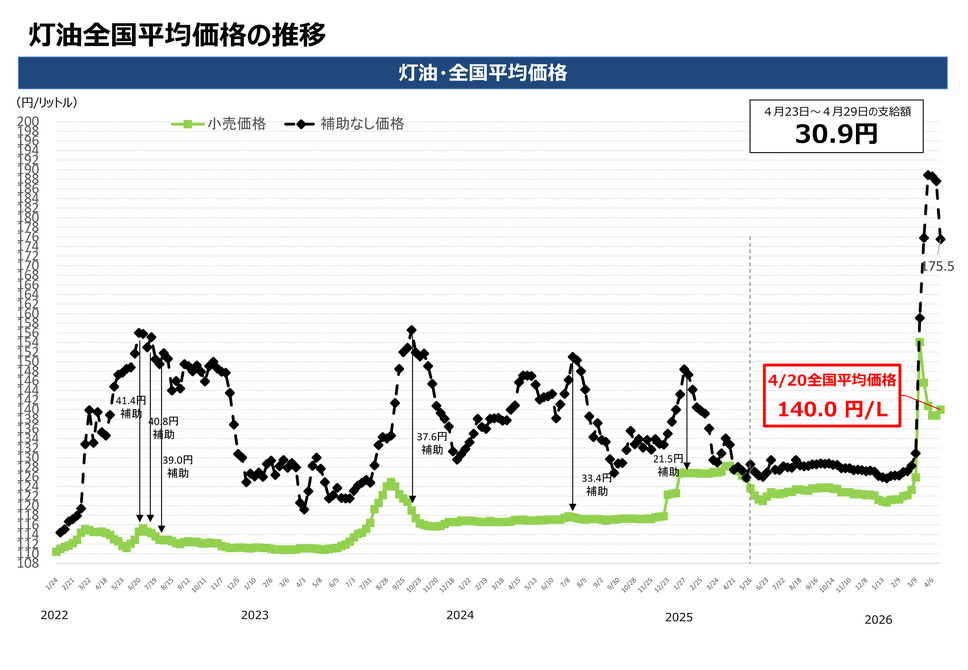 燃料油価格定額引下げ措置に基づく補助額は、4月23日(木)から4月29日(火)の適用分として30.9円です。