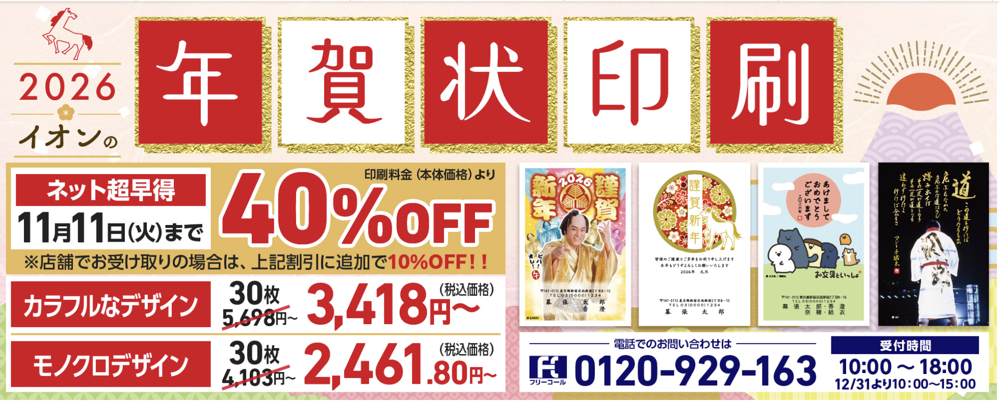 イオンの年賀状はネットから申し込むことができ、インターネット限定割引が11月11日(火)まで40%OFFとなっています。